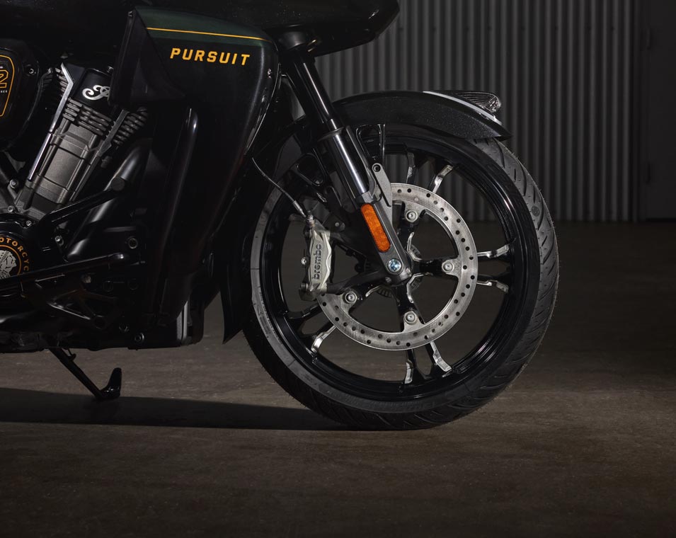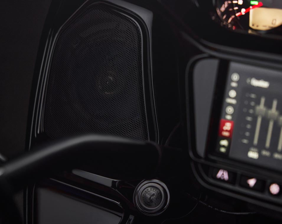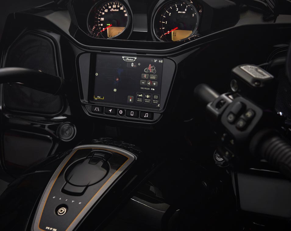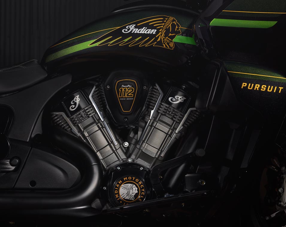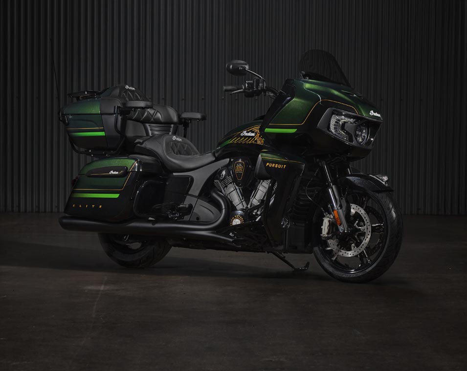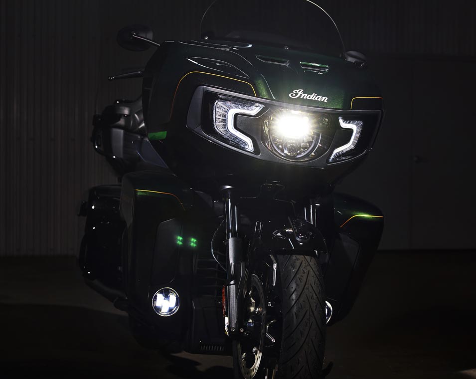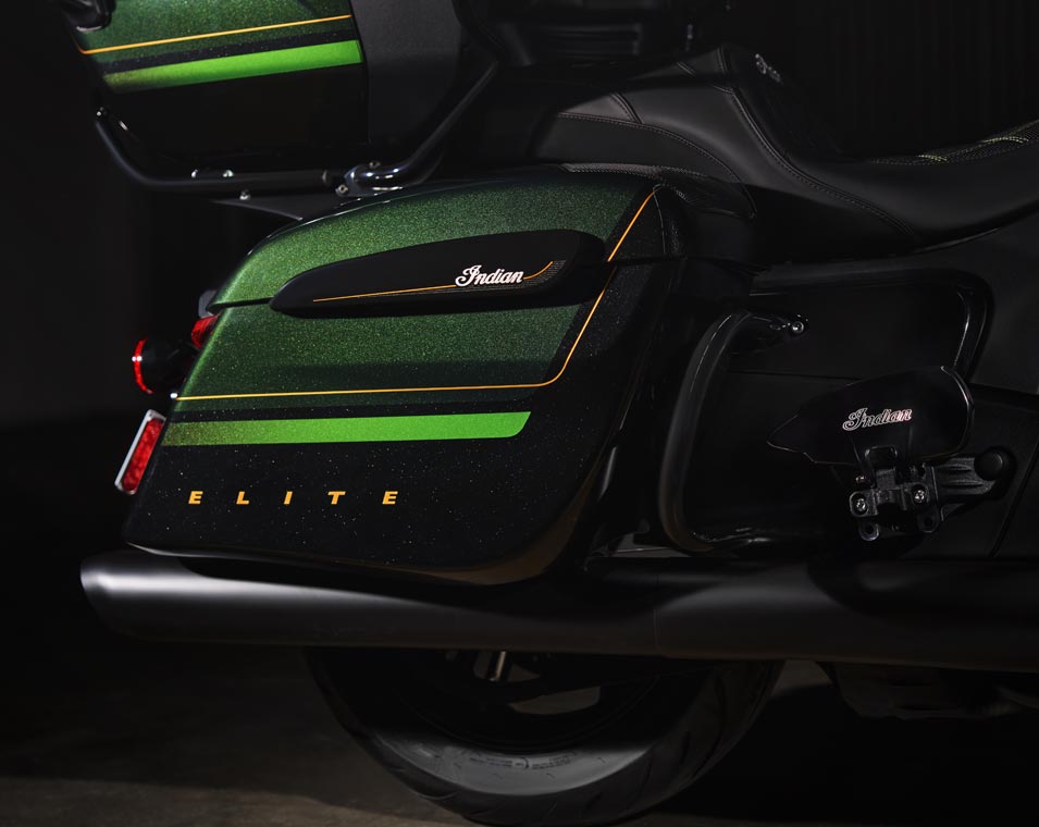 | SERIENAUSSTATTUNG | Fernverschließbare Koffer, elektrisch verstellbares Windschild, 140+ Liter Stauraum, schlüssellose Zündung, verstellbare Verkleidungsklappen, USB-Ladegerät, Reifendruckkontrollsystem (TPMS), Indian Fussbretter für Fahrer und Beifahrer, beheizbare Sitze mit grünen Nähten, beleuchtete Schalter mit beheizten Griffen, Armlehnen für den Beifahrer und Fahrscheinwerfer |